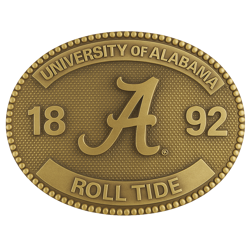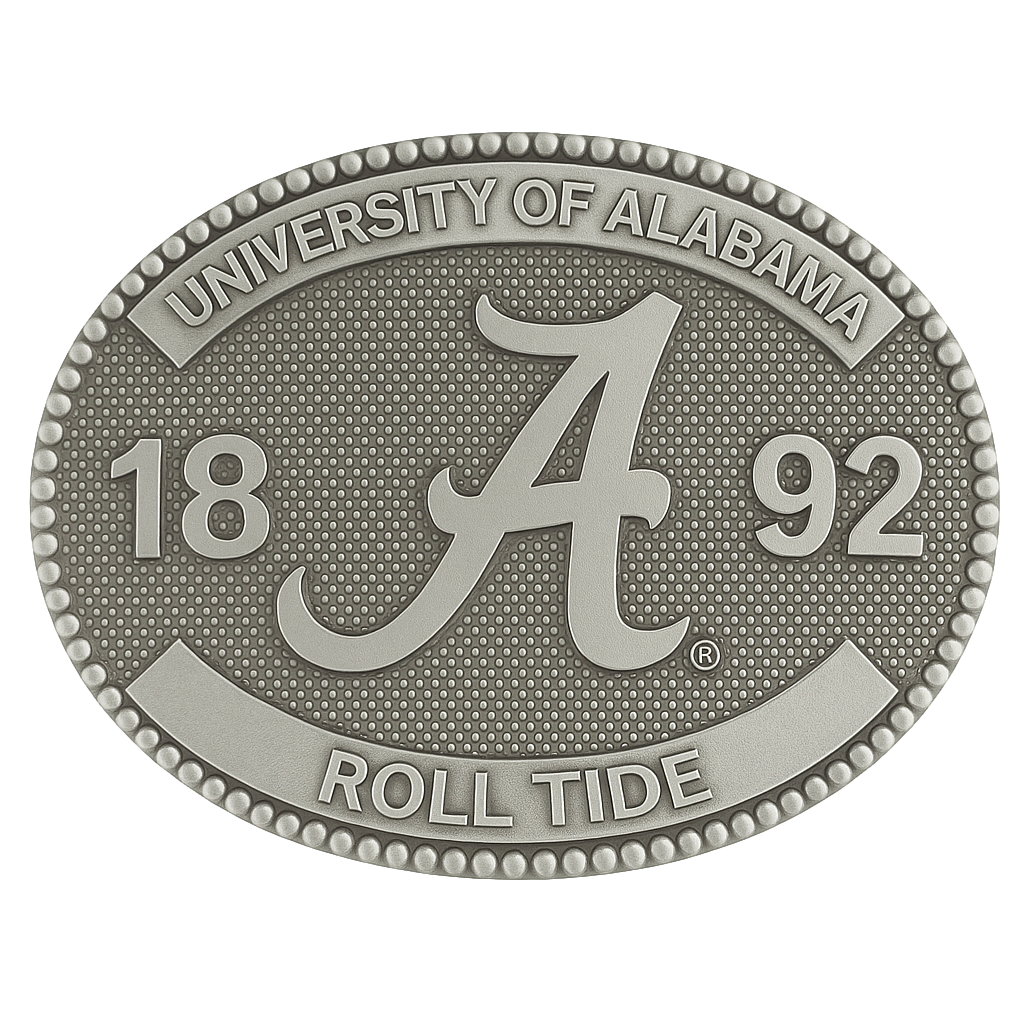This rodeo-style belt buckle is a proud tribute to the University of Alabama’s enduring legacy. At the center stands the unmistakable scripted "A" logo, flanked by the founding year “18” and “92.” “UNIVERSITY OF ALABAMA” arches across the top, while the rallying cry “ROLL TIDE” anchors the bottom. Framed with a bold, Western-style beaded border, this buckle is available in premium Sterling Silver or Brass—crafted for Crimson Tide fans who wear their pride front and center.